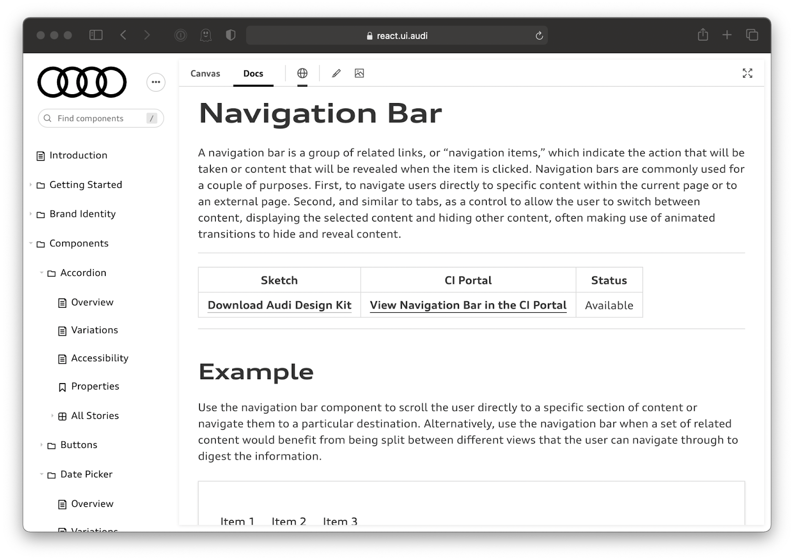 Some teams build a custom docs site to tweak the experience to match the specific needs of their users. Shopify's Polaris and IBM's Carbon Design System are two great examples.