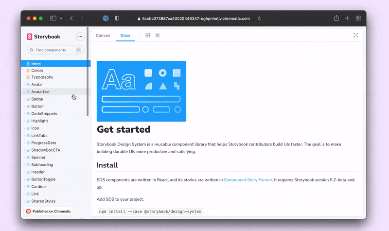 Teams already use Storybook to build their design systemโs components. They write stories to demonstrate how each component is used. Docs addon uses these stories to auto-generate documentation for each component.