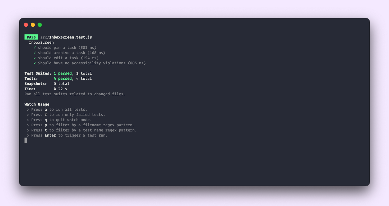 Run yarn test to start up Jest. It'll execute all the interaction tests and run the accessibility audit too. You can now run this entire test suite any time you modify the code. Allowing you to catch regressions.
