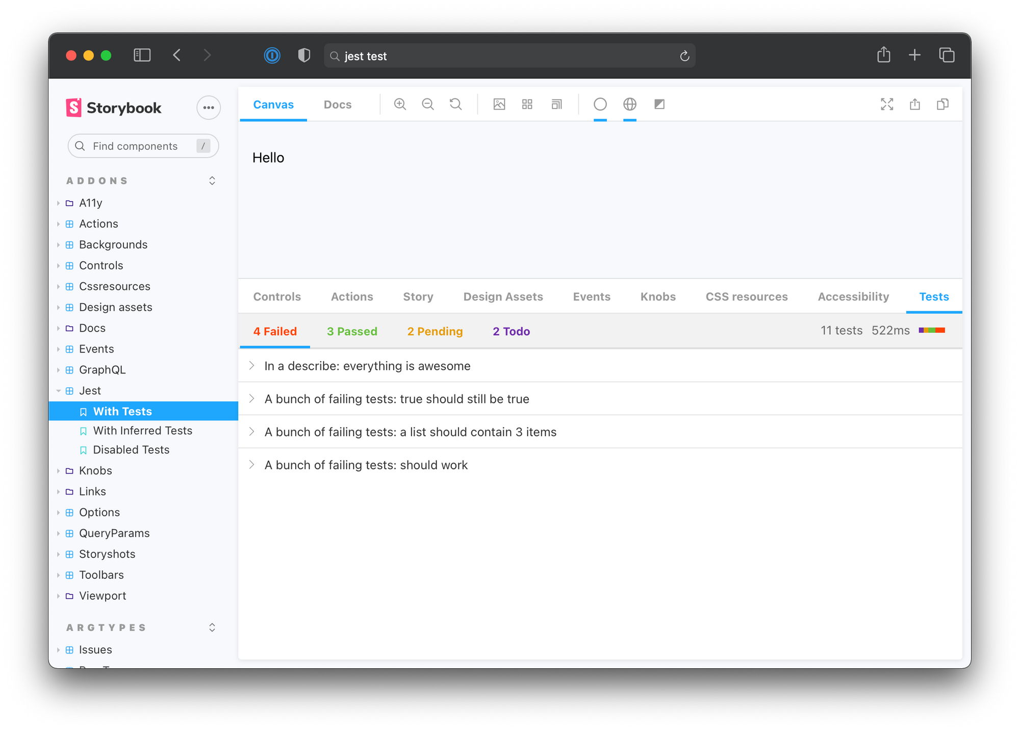 Jest addon shows the output of Jest unit tests in the Storybook panel. Itโs a helpful way to get instant feedback on tests while you build UI components.