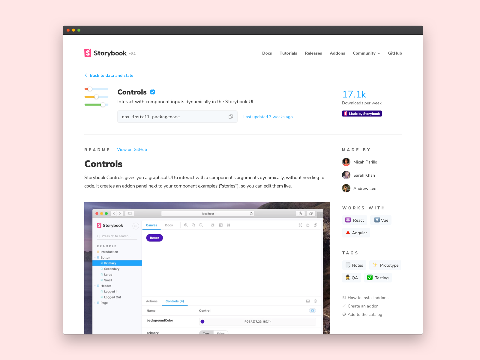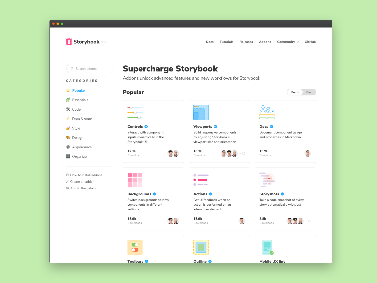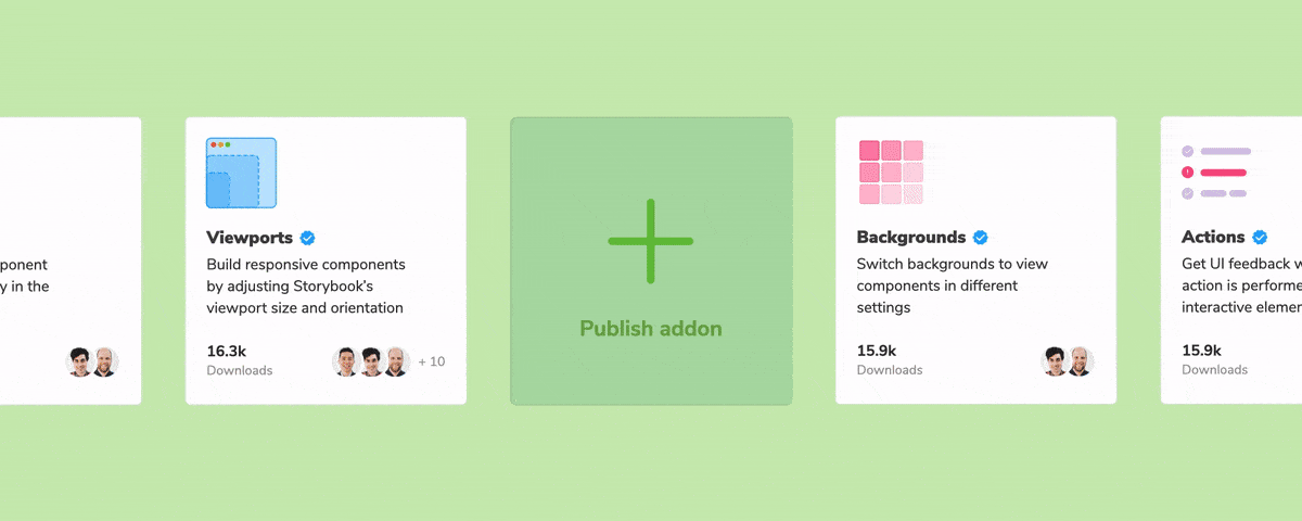 The addon ecosystem is flourishing thanks to our community. Since the beta launched, we've seen one new addon created every week (avg) by global teams and solo developers alike. Even venture-backed companies like Contrast (YC18) are launching tools for Storybook .