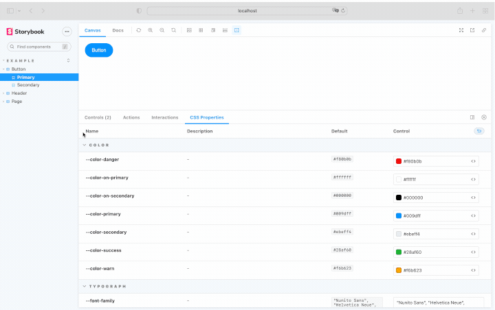 CSS Custom Properties: CSS variables help streamline your styling. Gustavo Bissolli 's addon auto-detects the custom CSS variables in a UI and gives you interactive controls to live-edit them. No need to open devtools or touch a line of code.