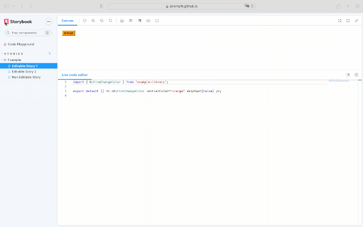 Interactive code editor: Sometimes, all you want to do is experiment in code without tabbing to your code editor or devtools. Jeremy Holcomb’s addon turns your Storybook stories into a coding sandbox. Try out the live demo.