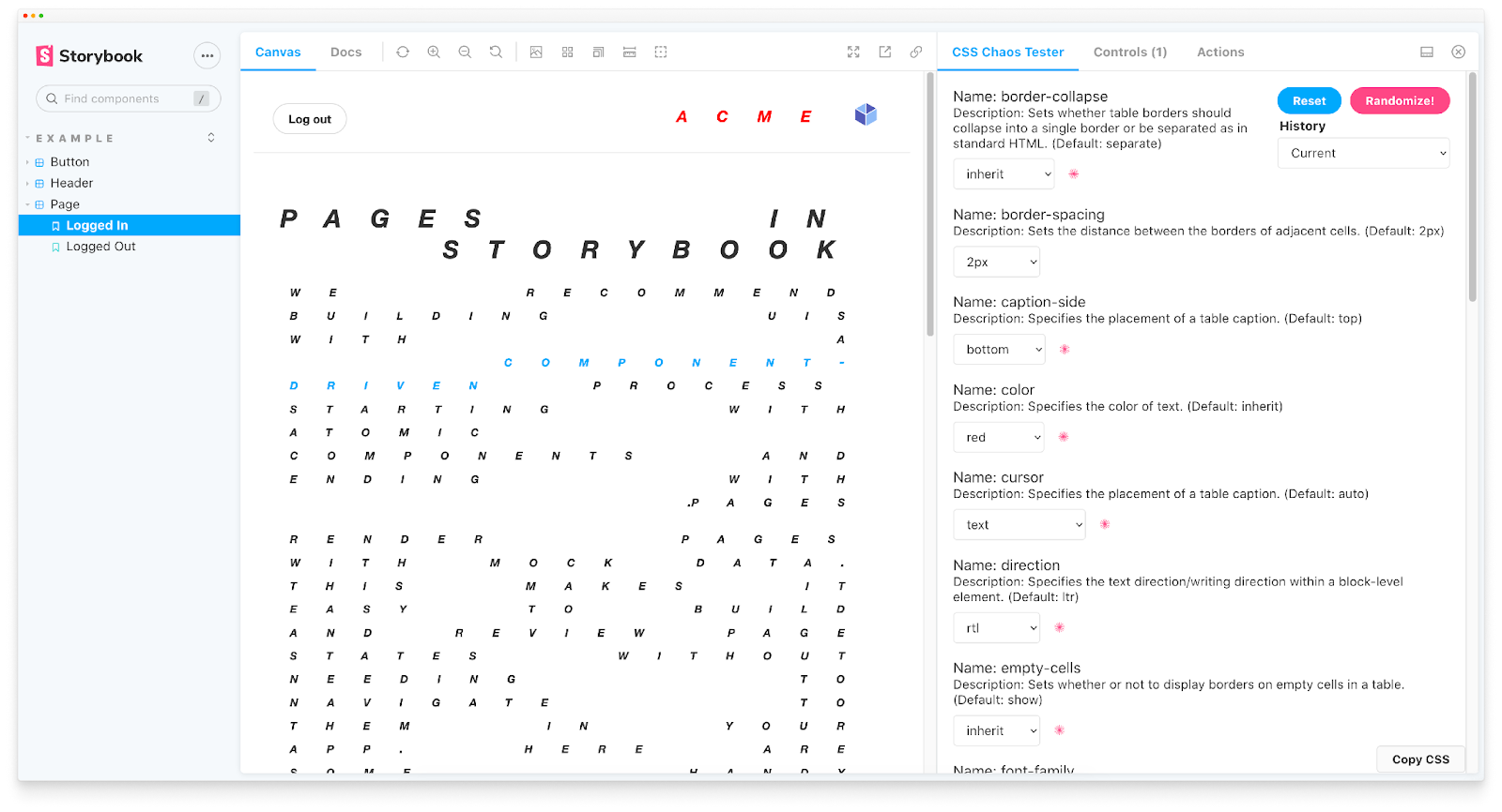 Chaos Addon: Is your component resilient to style bleeding? Alex Wilson’s addon applies inheritable CSS properties to a component to see how it breaks its styling.