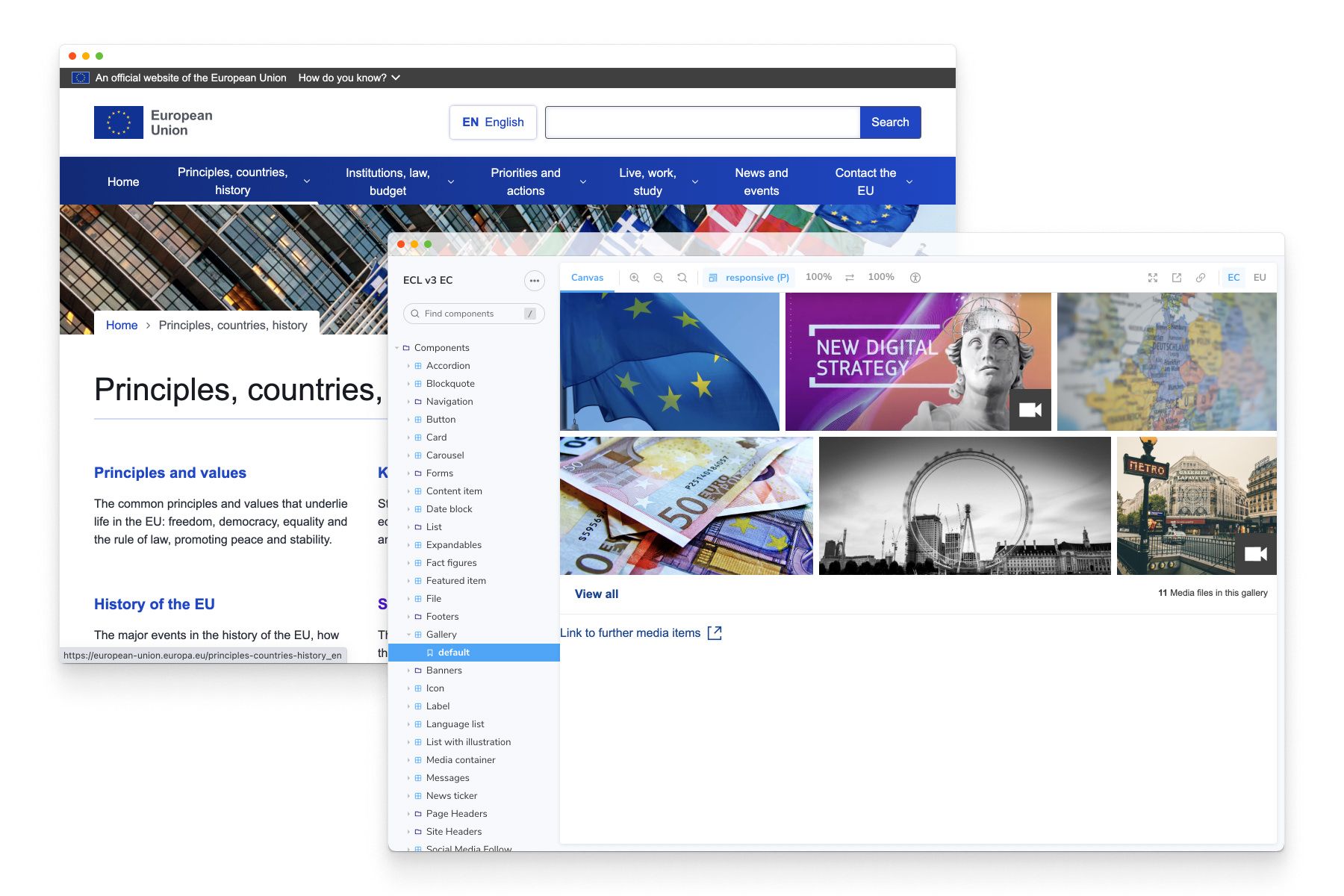 The European Union includes 27 member states that account for 447 million people. The Europa Component Library (ECL) provides a standard set of UI components, built in Storybook, for use on all Europa websites and apps.