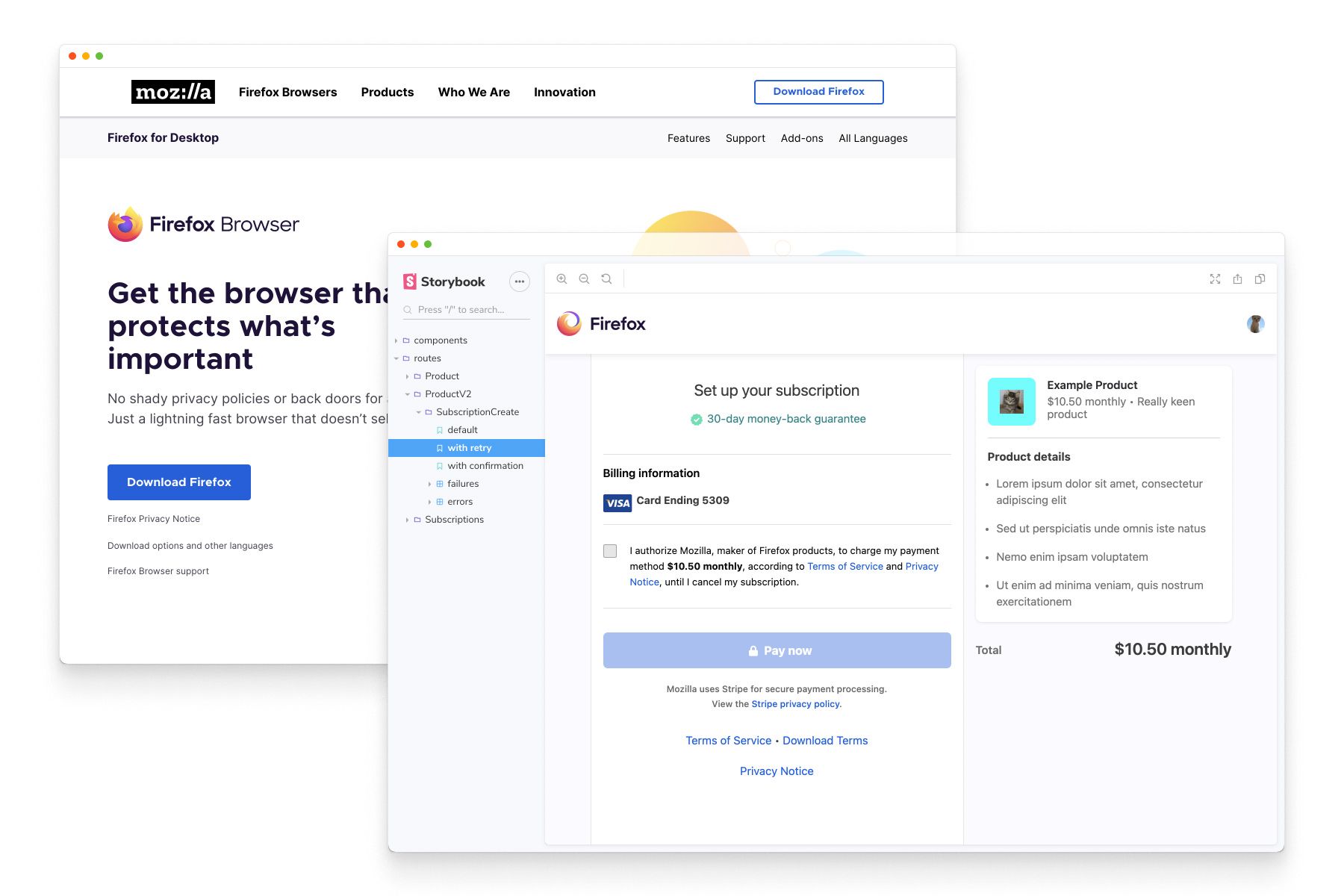 Firefox’s 198 million users makes it one of the most popular browsers of all time. Firefox’s payment UI is built in isolation with Storybook. That simplifies frontend development by disentangling the user interface from messy payment and billing logic.
