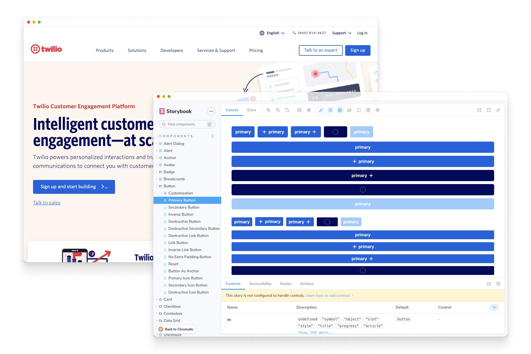 Twilio powers text messaging and phone calls for 250k apps. They have customers in 180 countries that communicate in different languages with different services. The product surface area is vast, so they built a design system in Storybook to streamline how devs prototype and ship UIs.