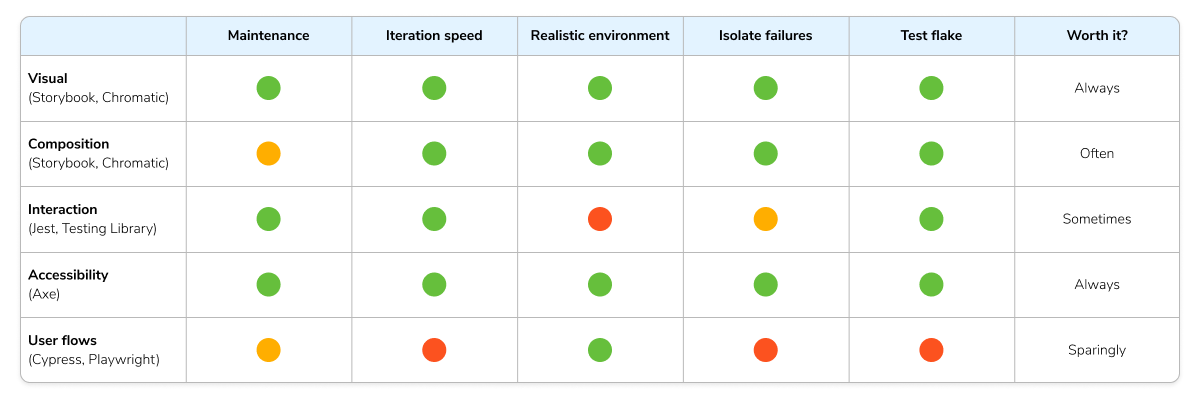 A comprehensive UI testing strategy balances effort and value. But there are so many ways to test that it can be overwhelming to figure out whatโs right for any given situation. Thatโs why many teams evaluate different testing techniques using the criteria below.