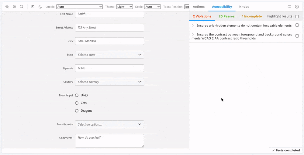 The Twilio Paste team uses jest-axe integration to run an automated accessibility audit on components. Axe is also available as a plugin for Storybook.