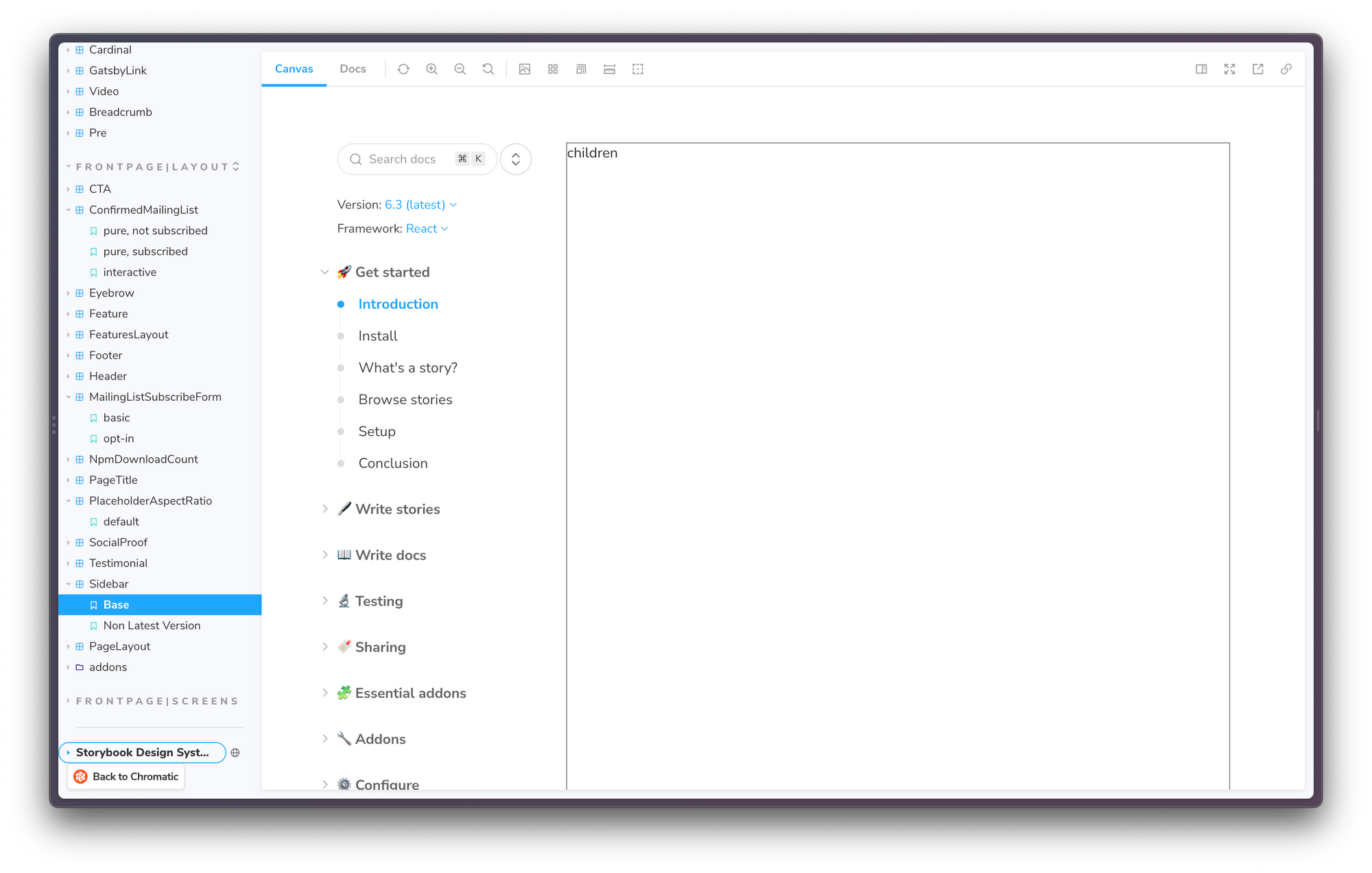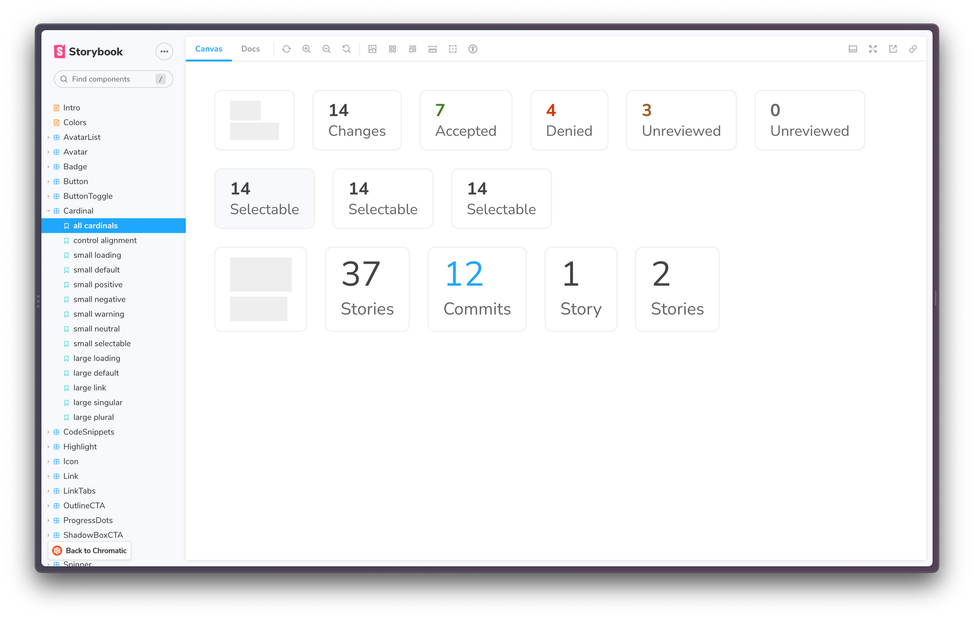 While Storybook is widely used for design systems, it's also common for front-end teams to write stories for application components. These components are "connected" to app state, context, and hooks which yields more complex variations. Devs choose to build connected components in Storybook because it's ย easier to develop hard-to-reach use cases such as loading, error and empty states.
