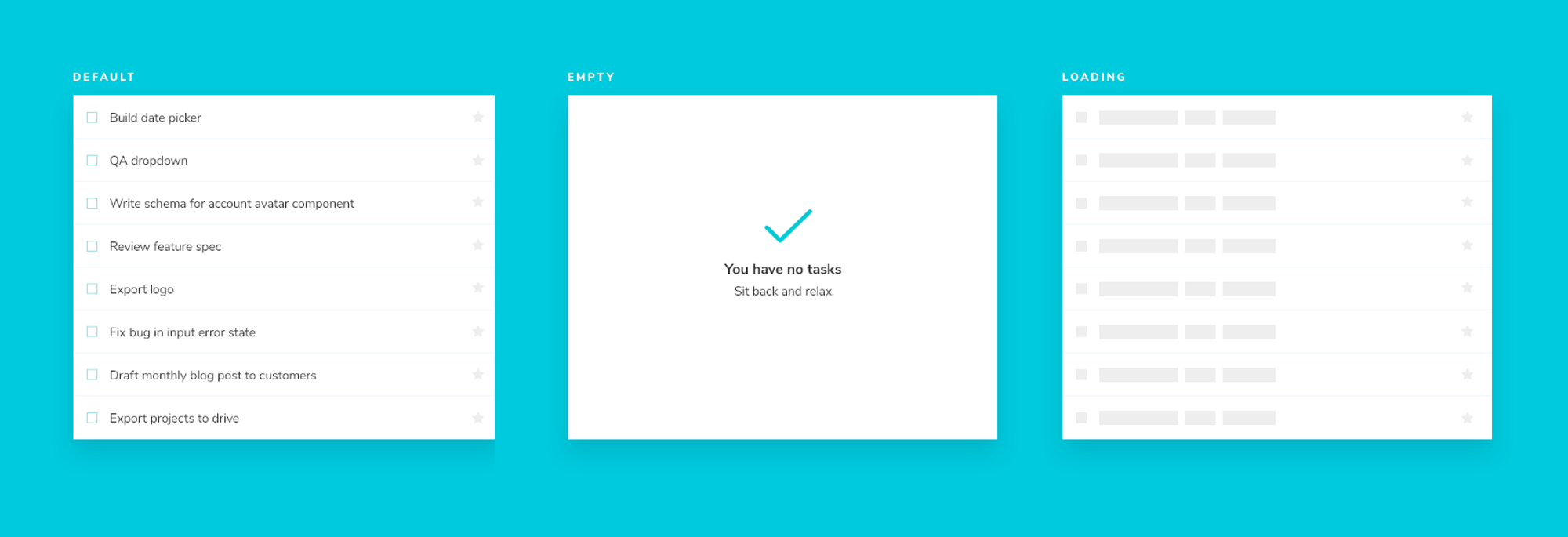 Consider this TaskList component wired up to a Redux store. The application state within that store determines which variant of the TaskList is rendered.