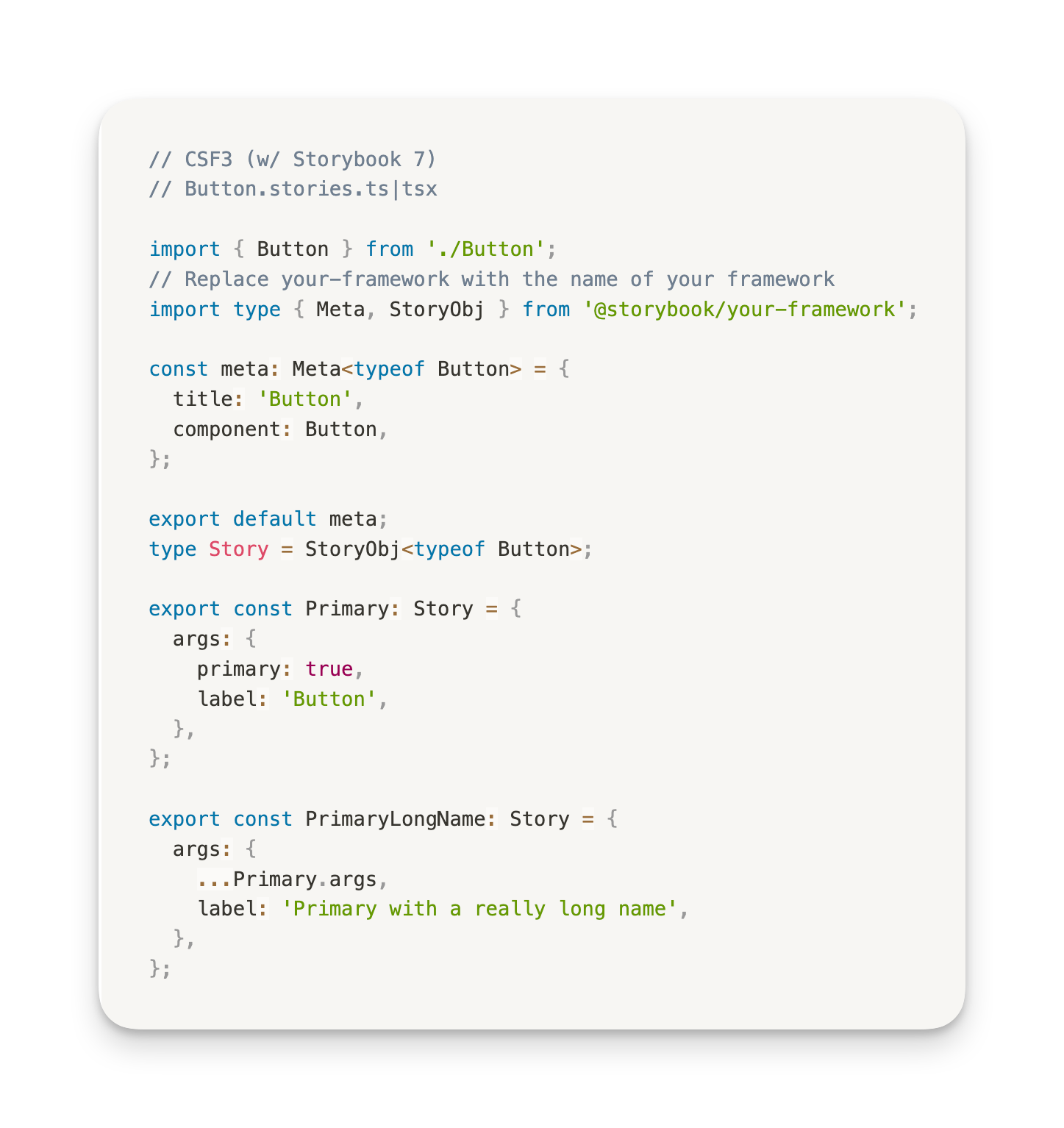 CSF3 enables you to manipulate stories as objects. To facilitate this, we have also created a StoryObj type, which automatically infers the type of component props.