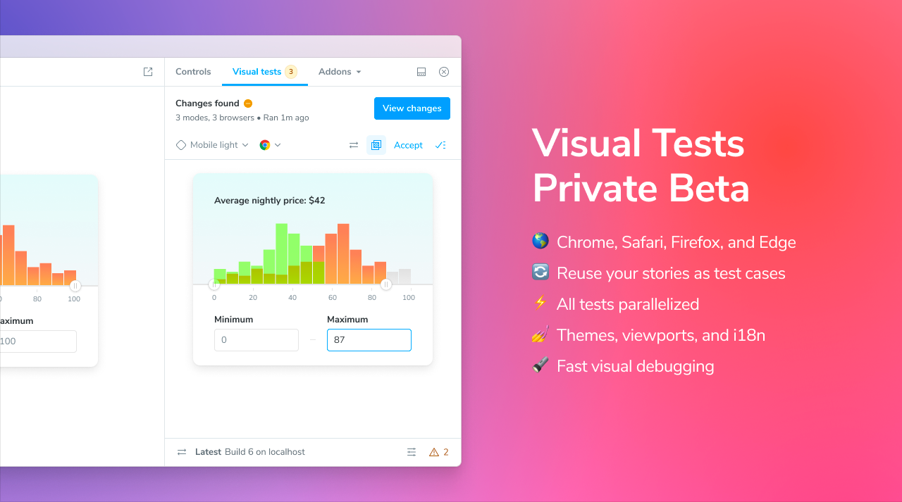Over 1,000 devs are already signed up for early access to Chromatic Visual Test Addon, which brings 1-click visual tests to your Storybook. Learn more about the private beta and get it now!