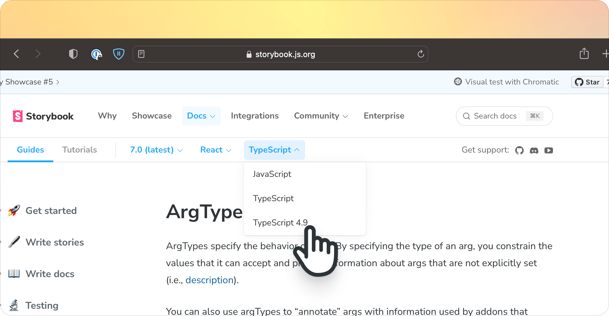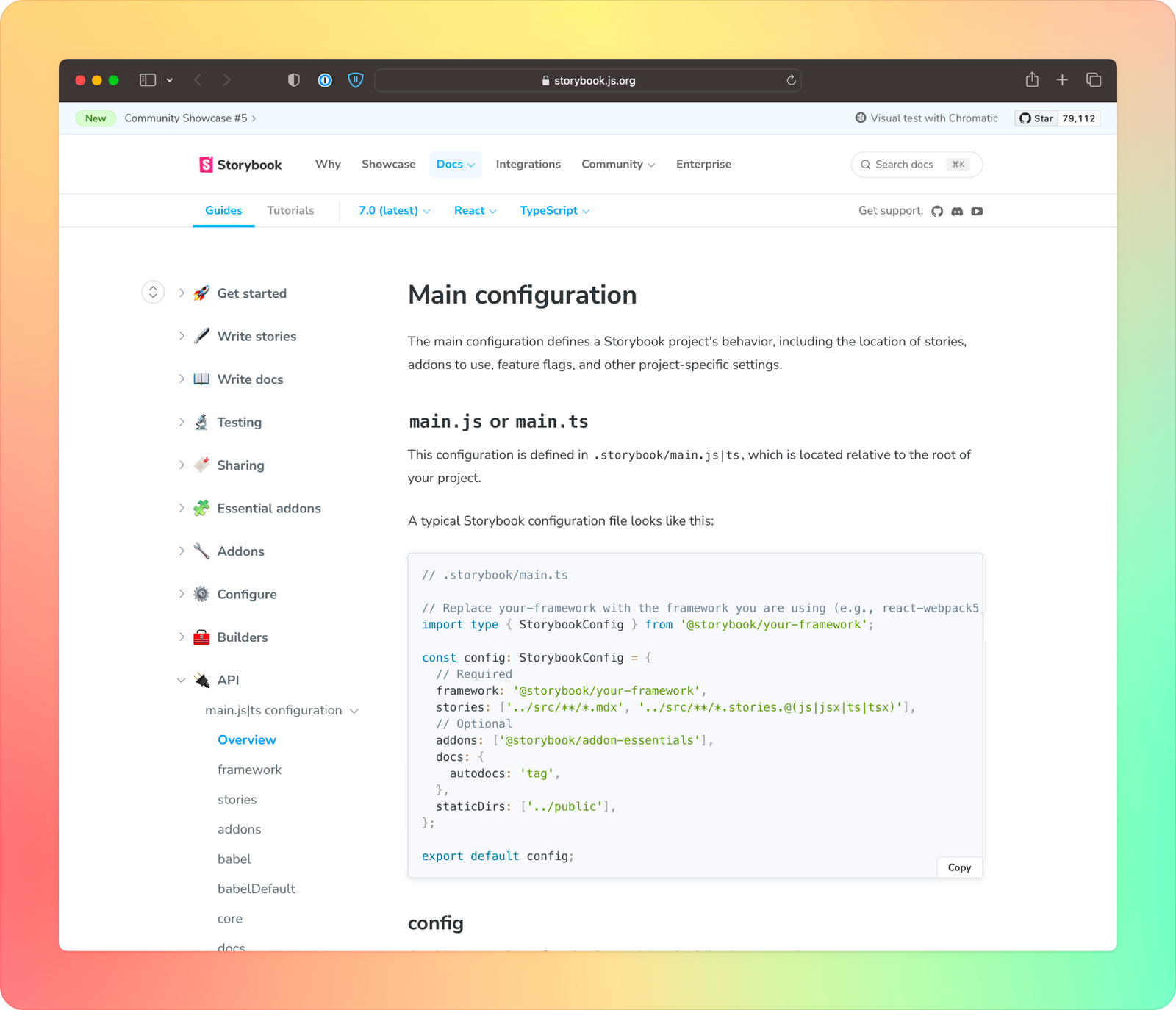 Within Storybookโs documentation, weโve introduced API references for configuration files, ArgTypes, and Doc blocks in Storybook Docs. Weโve also made Storybook's documentation TypeScript-first, as TS accounts for over 80% of all Storybook projects.