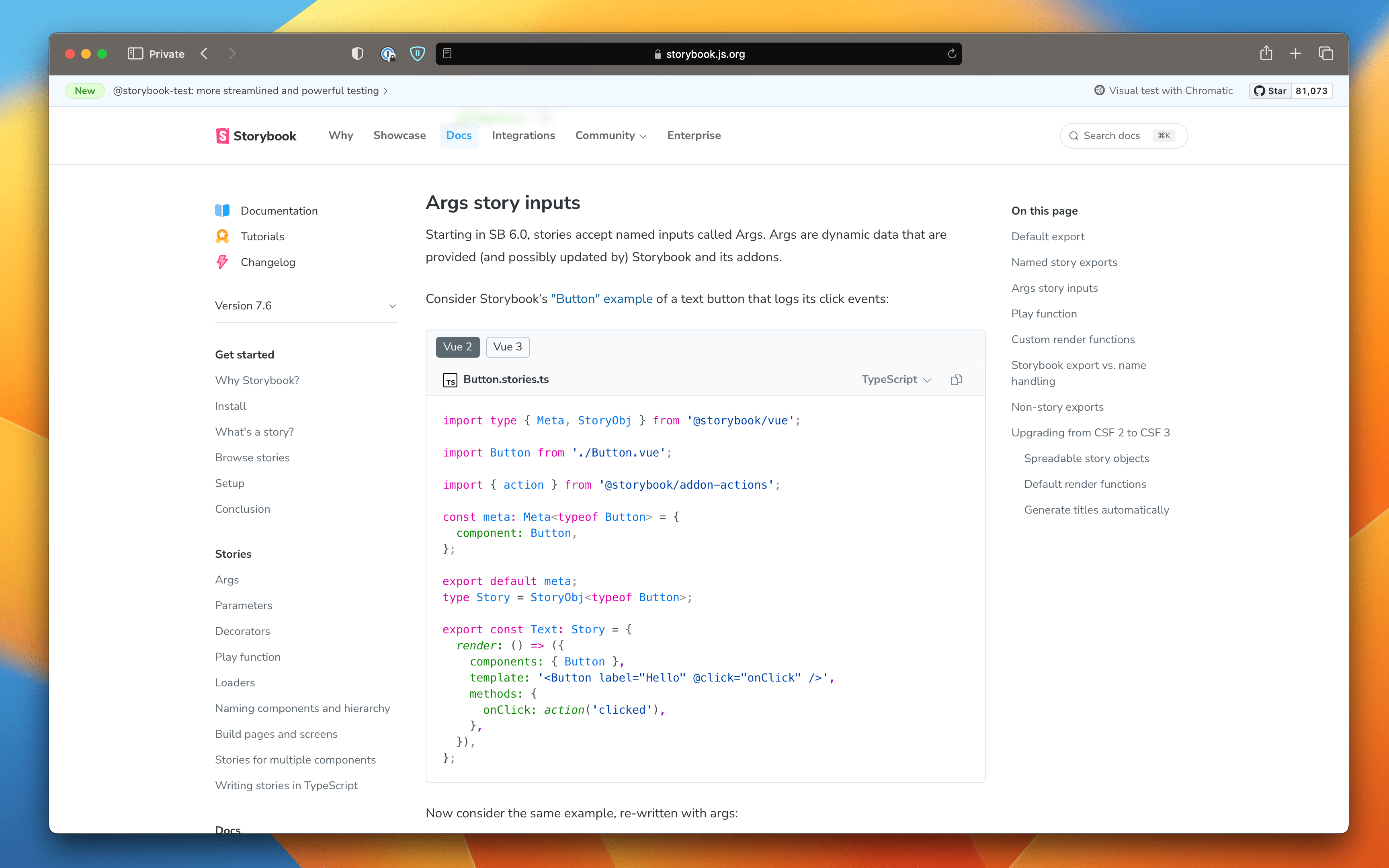 We've taken the 7.6 launch as a moment to make Storybook's docs site more useful and clear. The biggest change is that we now remember your preferred renderer (React, Vue, Angular, Web Components, etc.), package manager (npm, pnpm, yarn), and code language (TypeScript, TypeScript 4.9+, JavaScript). This let us remove the renderer from URLs, ensuring that when you visit a docs link (even old ones that did include a renderer), your preferences are always remembered. Choosing your preferences is also more obvious, with the pills under the page title and menus attached to the relevant code snippets.