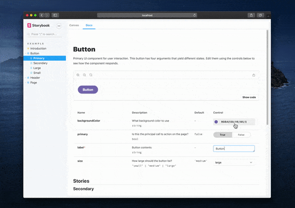 Controls works with Docs, Storybook’s automated documentation generator for UI components, including both DocsPage and MDX.