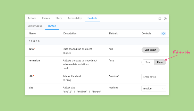 Controls uses types to generate graphical controls. It requires no extra work and is seamlessly integrated into the Storybook developer experience.