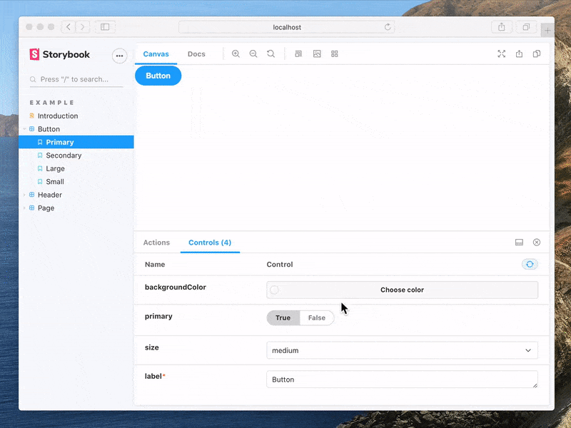 Your component's controls and docs are always up to date because they're generated automatically from the source code. You don't need to keep track of your UI documentation whenever a component's API changes, Storybook does that for you.