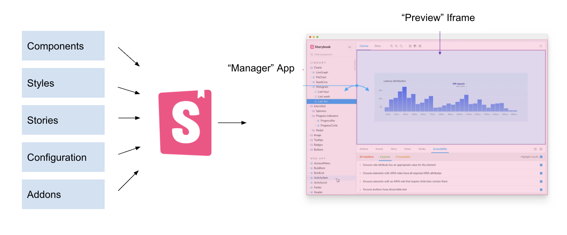 At its heart, Storybook is a build tool. The user edits components, themes, stories (component examples), and a toolchain transforms the source code into an executable bundle, updating the browser in real time.