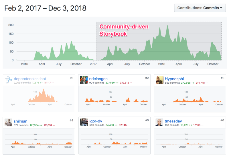 Storybook’s success is directly a function of our community and we are committed to doing right by our users. We operate the project under the principle of OPEN open source, which is about recognizing contributions and trying to enable as many people to contribute as possible. Our insanely long list of org members with GitHub write access (83 and growing) is a testament to this, as is Norbert’s persistent evangelism and tireless onboarding of new project members.