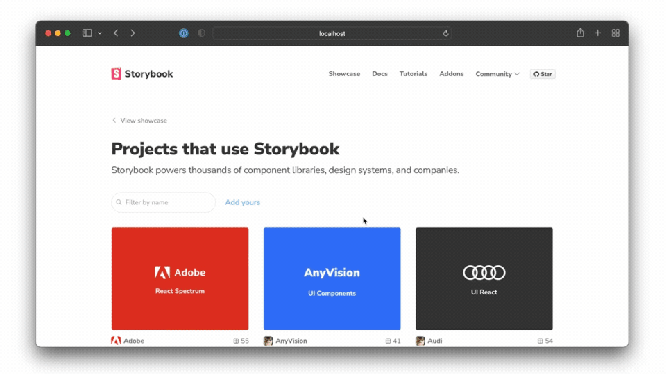Storybook is the workshop environment where all UI code gets built, tested and documented. It's used by front-end teams at Shopify, Workday, Adobe, The Guardian and many more to ship robust UIs.