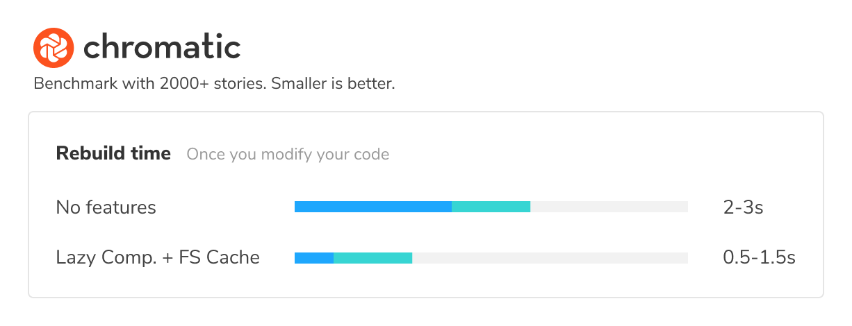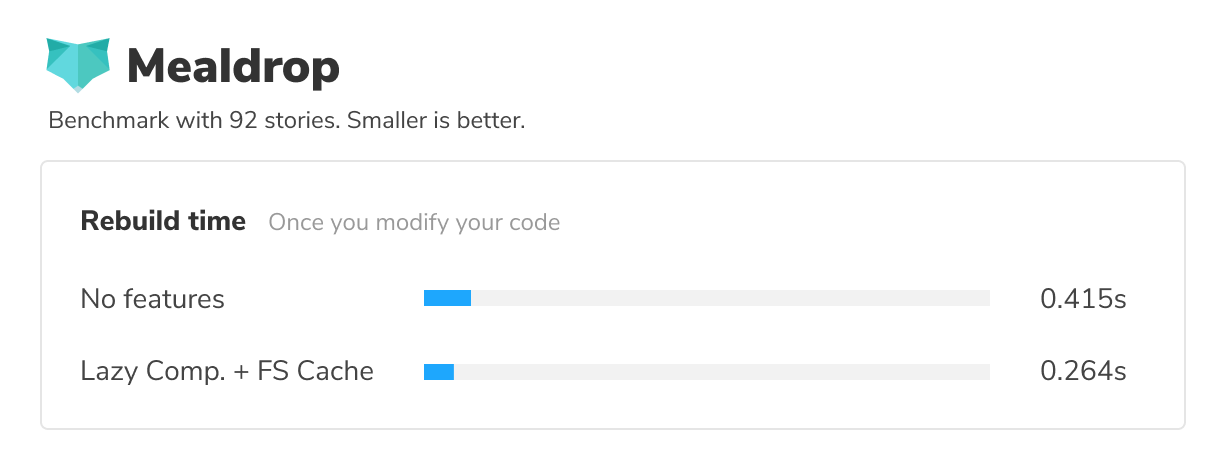 An additional benefit of compiling only the minimal number of story bundles is that Webpack will often need to do far less work to update the compiled code when you modify a component or a story.