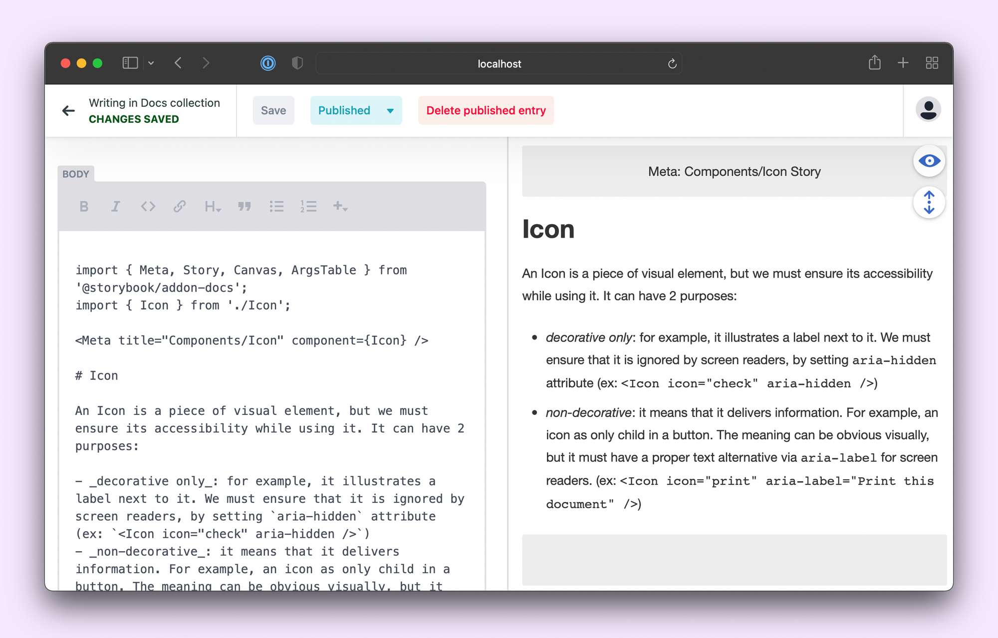 </html>Then deploy this update to your Storybook, enable Identity & Git Gateway (for auth), and your CMS should be accessible via: url_for_your_storybook/admin/index.html. Once you log in, youโll be able to edit your docs.