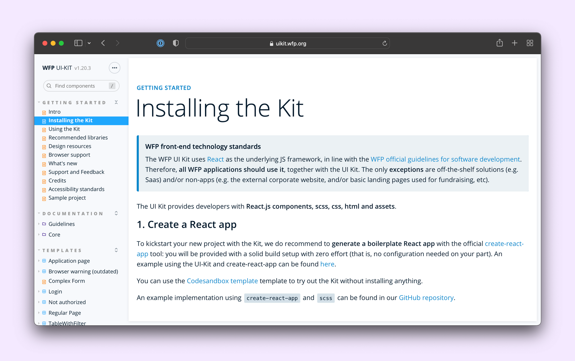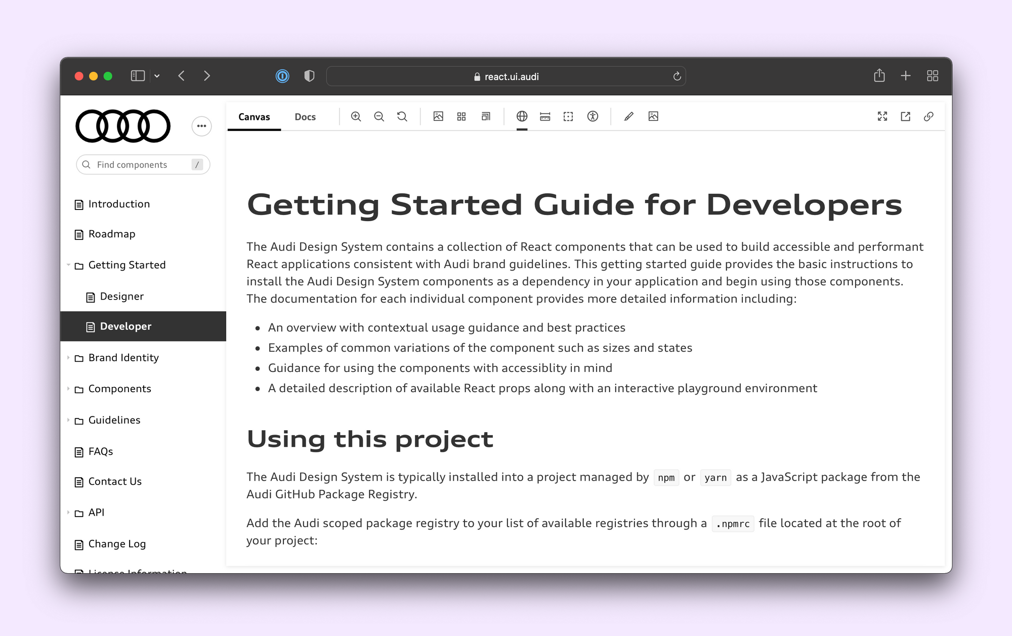 A getting started section shares how to use your Storybookโs components. This might include instructions to install, load CSS, or configure themes. The Audi design system has getting-started guides for both developers and designers. The United Nations World Food Programme has detailed usage guides that explain architectural choices.