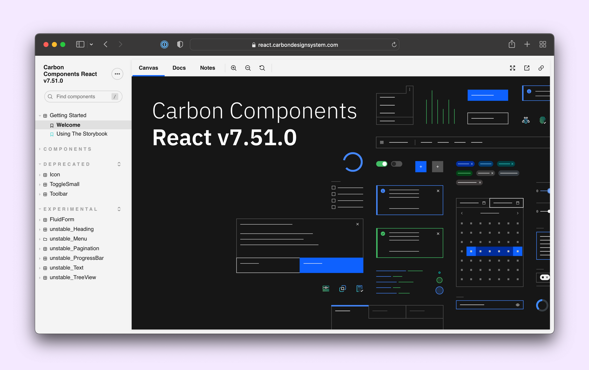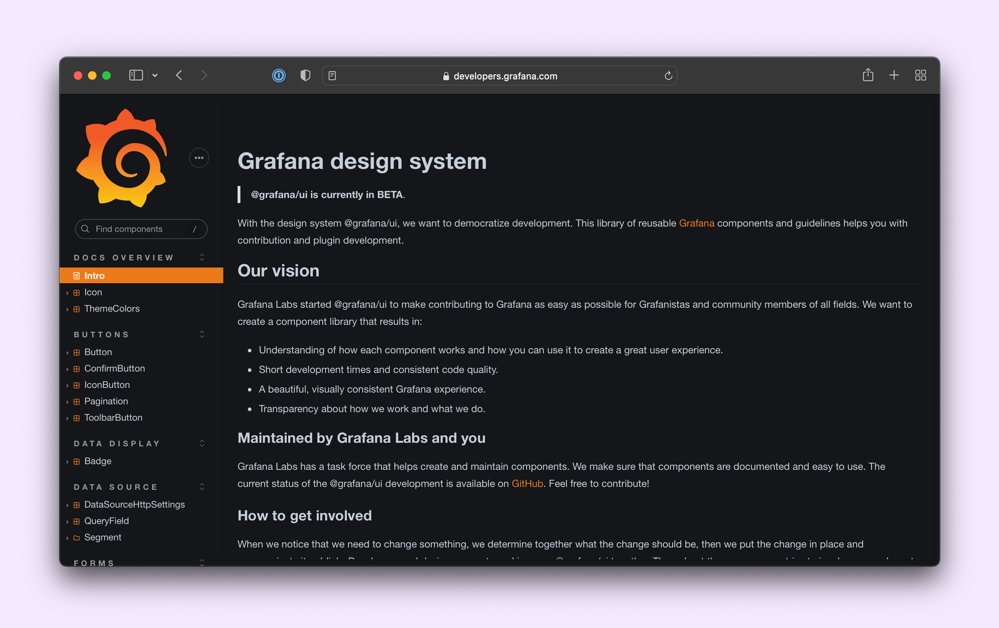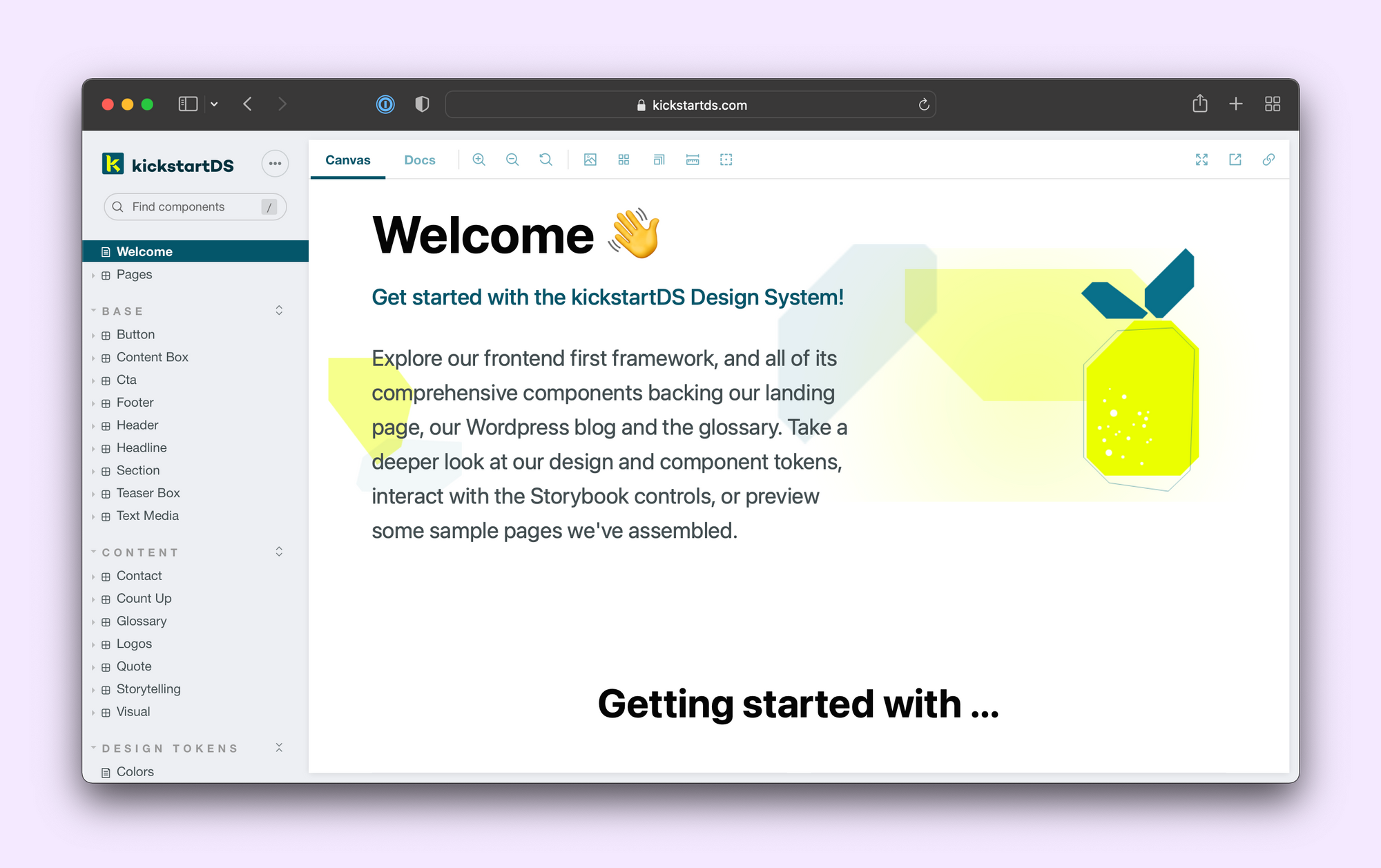 At the top, use Documentation pages to introduce folks to your Storybook and show them how to get started. MDX gives you complete control over the content. You can write prose interspersed with JSX components and embed all kinds of assets using MDX Embed.