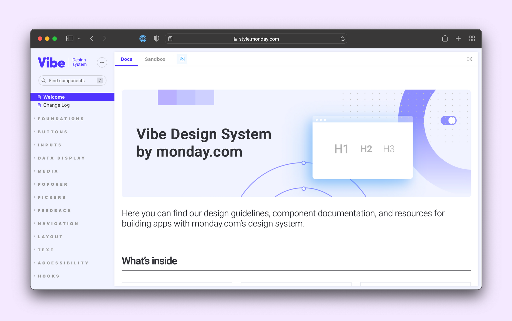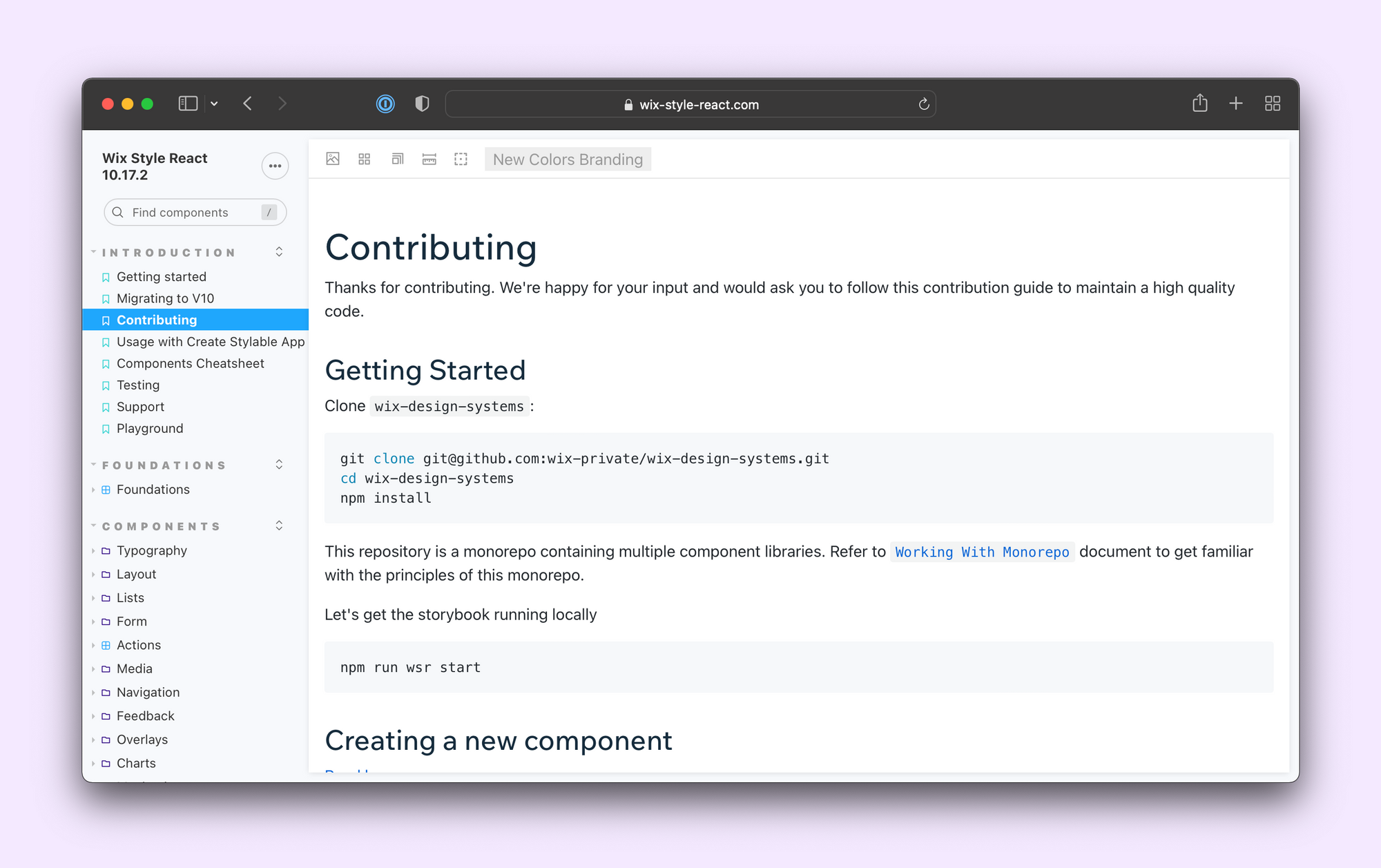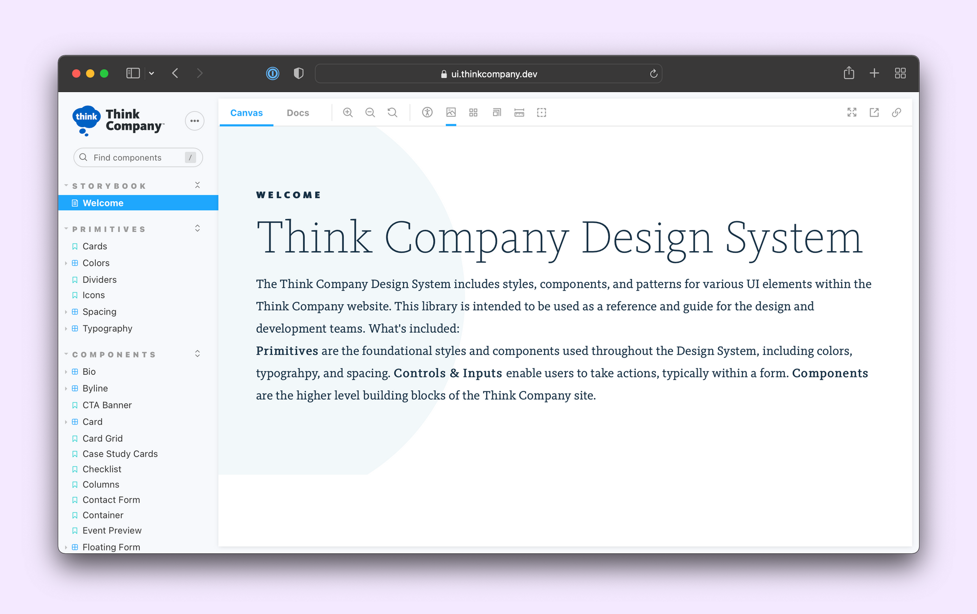 At the top, use Documentation pages to introduce folks to your Storybook and show them how to get started. MDX gives you complete control over the content. You can write prose interspersed with JSX components and embed all kinds of assets using MDX Embed.