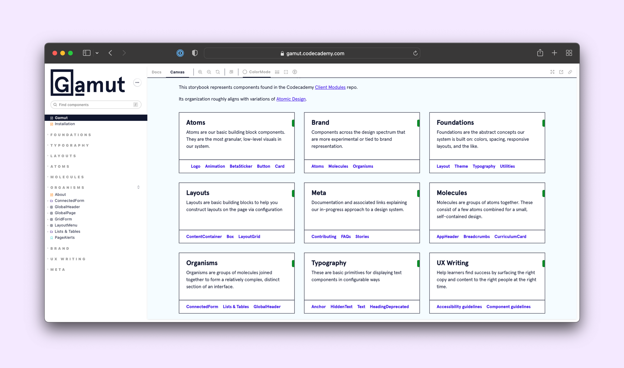 Teams like Codecademy adhere to all levels of the atomic hierarchy. While others, such as The Guardian and United Nations World Food Programme, only use a subset. Refer to Brad's Atomic Design and Storybook article to see how he uses Storybook.