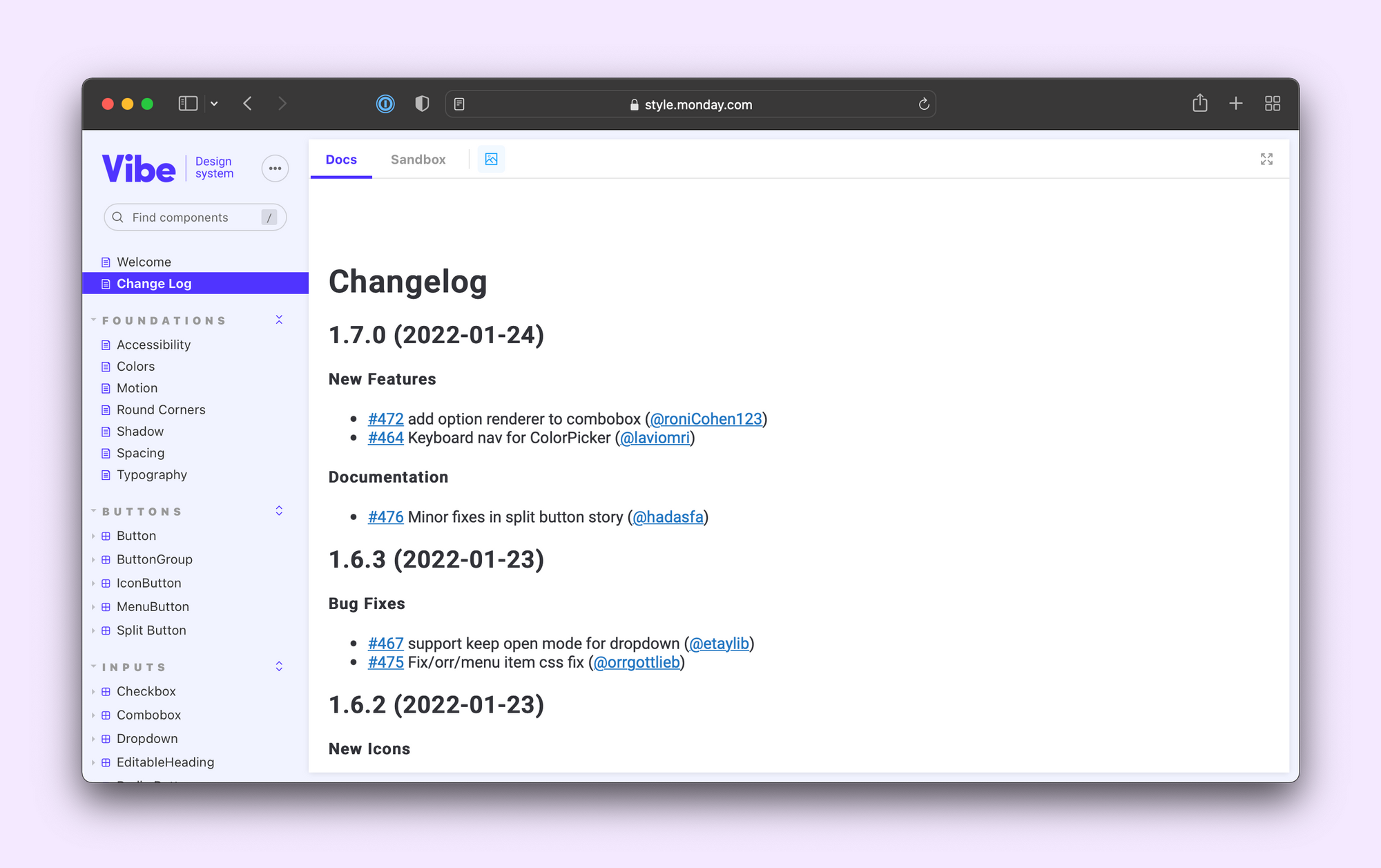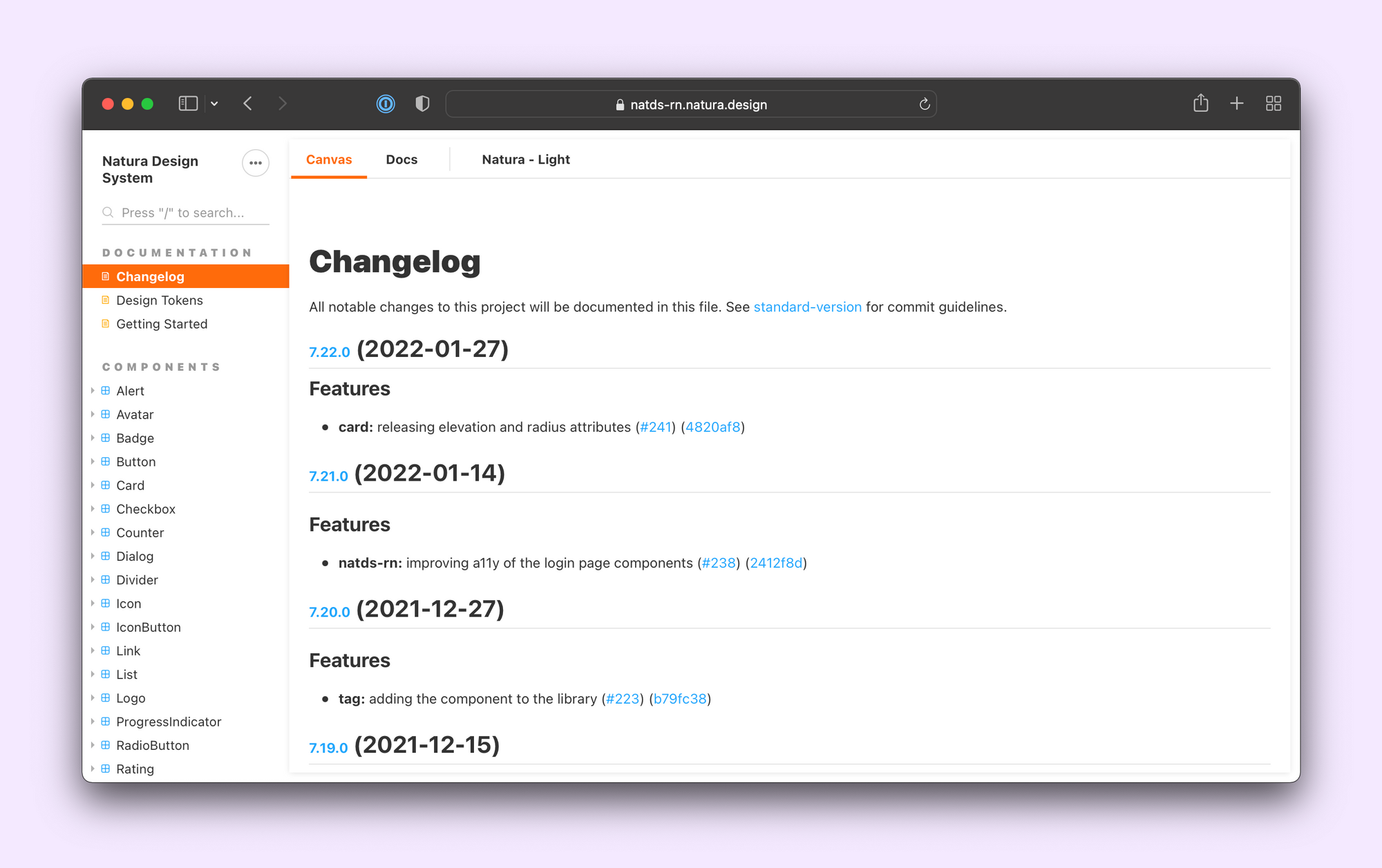 Healthy UI libraries and design systems receive constant updates. That means adding or removing components from your library or altering their APIs. The changelog page captures all these updates in one place. Itโs also an excellent spot to share your versioning strategy and project roadmap.