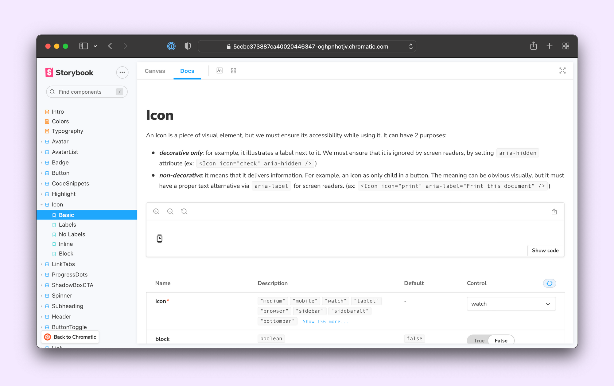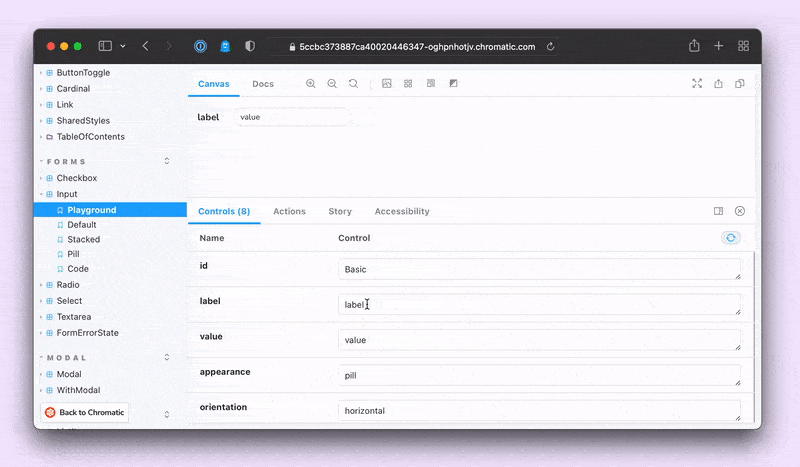 Next is a Playground story, where all the component props are wired up to Storybook controls. This works well for demonstrating the component API and prototyping in the browser.