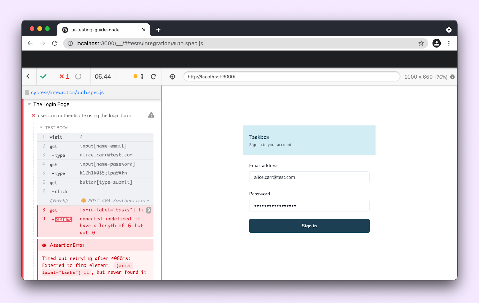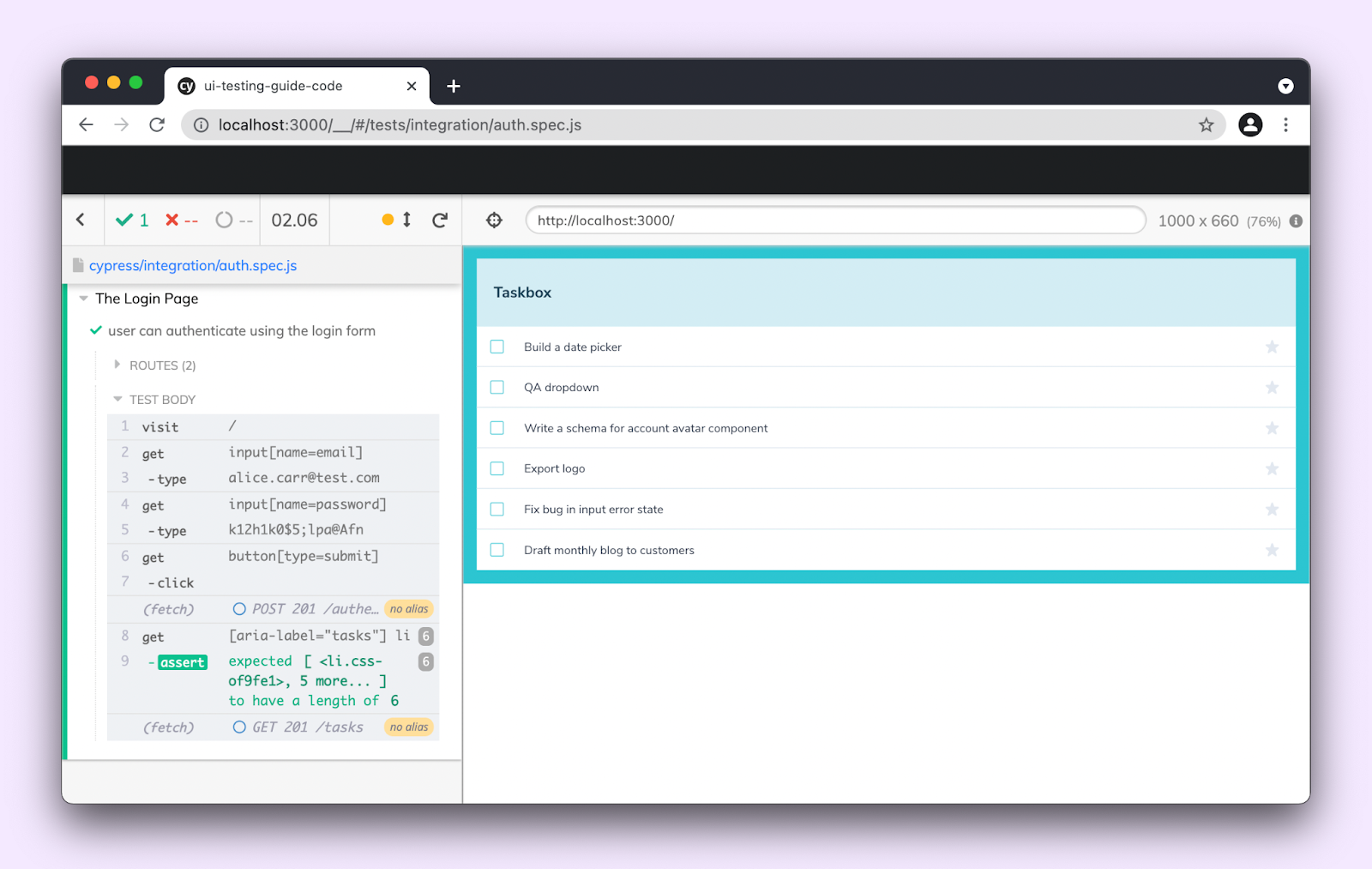 The last bit of the test runs assertions. In other words, we verify whether the authentication was successful. We do this by checking to see if the list of tasks is now visible.