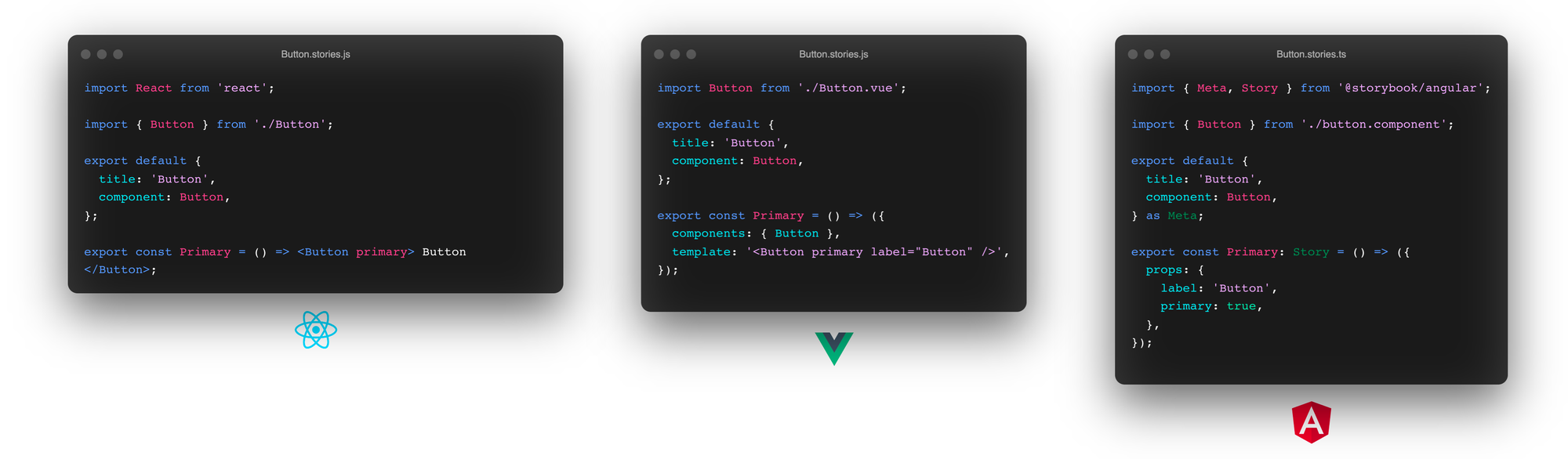Storybook is powered by Component Story Format, an open standard based on JavaScript ES6 modules for component variations. This enables interoperation between development, testing, and design tools. Each story is exported as a JavaScript function enabling you to reuse them with other tools. No vendor lock-in.