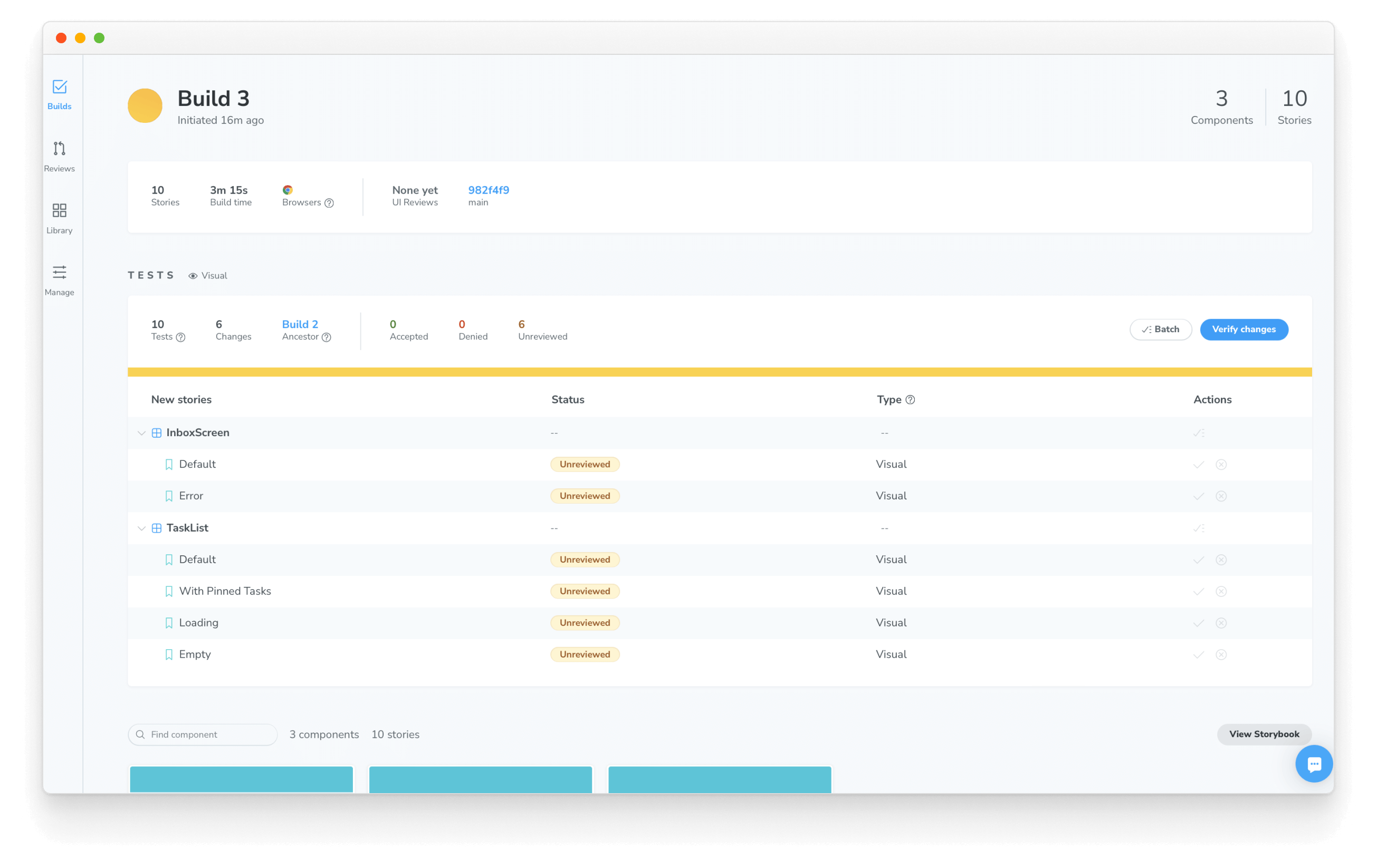 In the previous chapter, we set up Chromatic and went over the basic workflow. Now that we have stories for all our composite components, we can execute the visual tests by running: