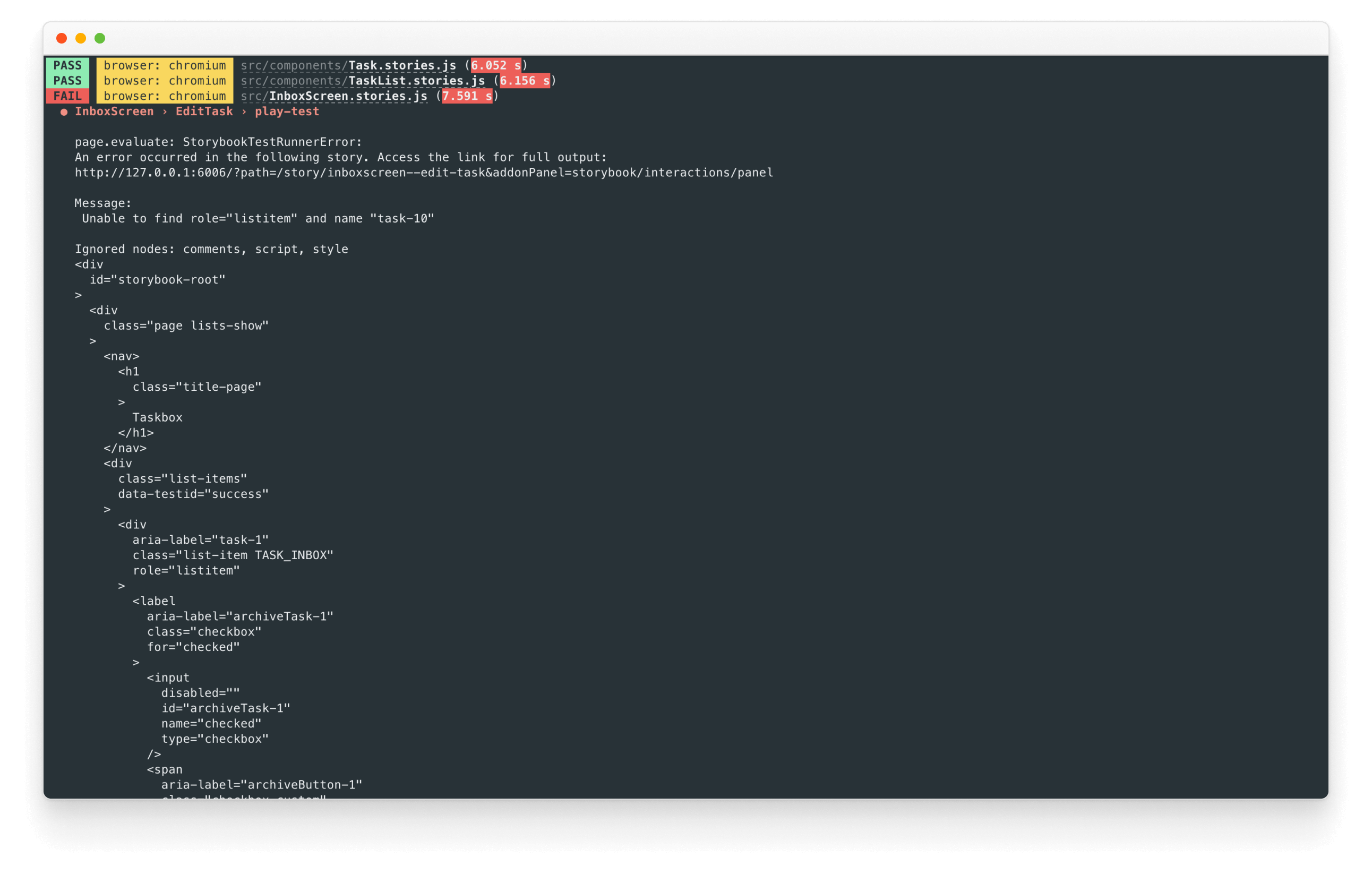 It'll verify whether all stories rendered without any errors and that all assertions are passed. If a test fails, you get a link that opens up the failing story in the browser.